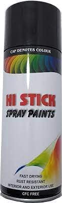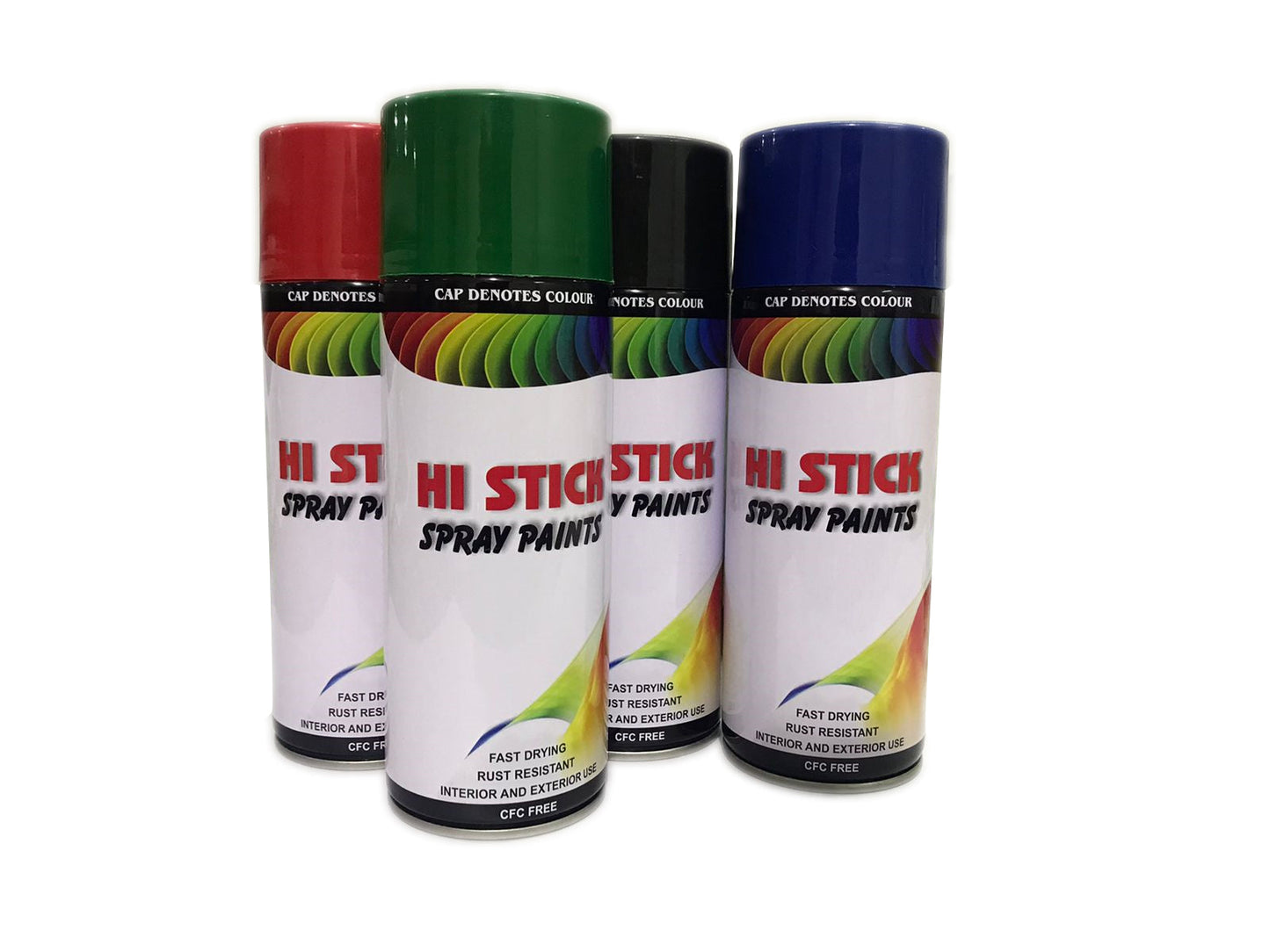 * Hi Stick Spray Paint is made from 100 % Acrylic resin and CFC free and used advanced technology. It has excellent hardness with excellent weather resistance. It exhibits great properties like good leveling, high coverage, high spray rate, fast dry, strong adhesiveness, rich color, and glossy.